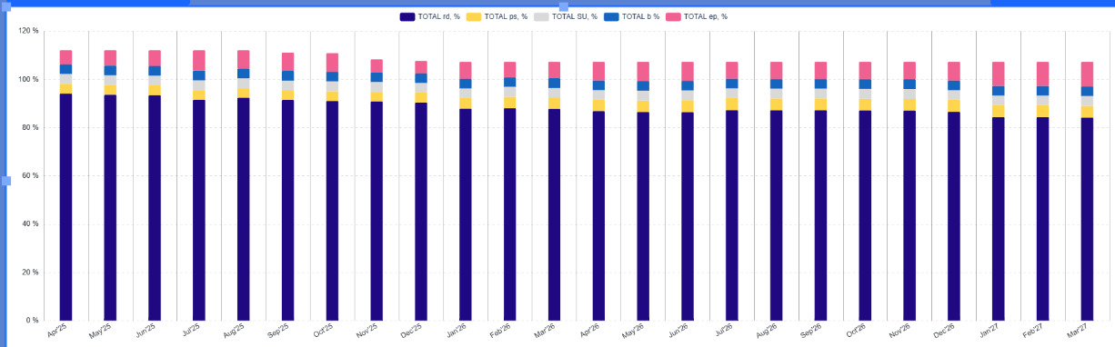 Данный бар должен показывать долю по каждому показателю за конкретный месяц относительно остальных показателей. Например: TOTAL rd% = TOTAL rd/(TOTAL rd+TOTAL ps+TOTAL SU+TOTAL b+TOTAL ep) и так все остальные показатели. Итоговые результат по всем показателям равен 1 или 100%.