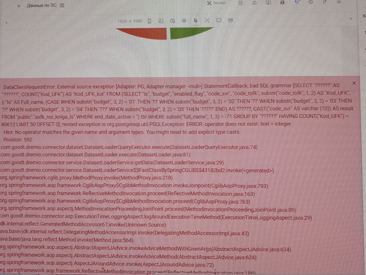 он явно ругается на формат. Вы взаимодействуете числом с текстом, точно у вас один формат поля в фильтре и круговой?