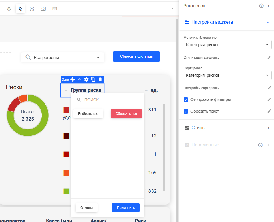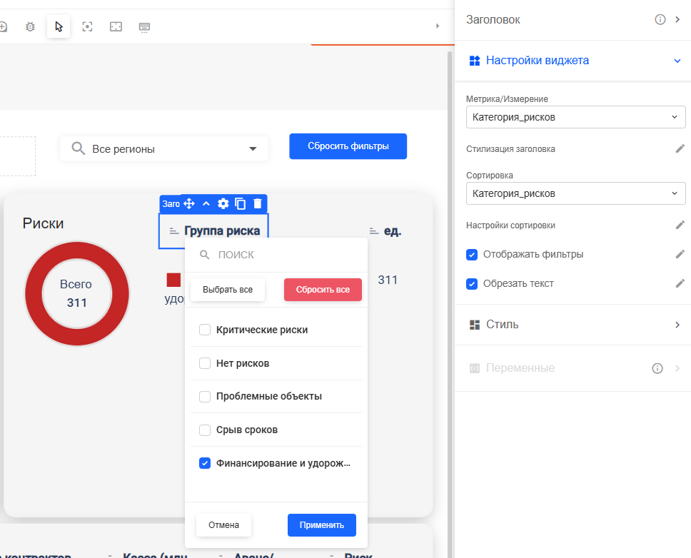 По какой-то причине фильтр из заголовка таблицы не может отобразить значения для фильтрации. Данные - измерение с простой varchar строкой, принимающей одно из 4 значений: Критические риски, Нет рисков, Проблемные объекты, Финансирование и удорожание.