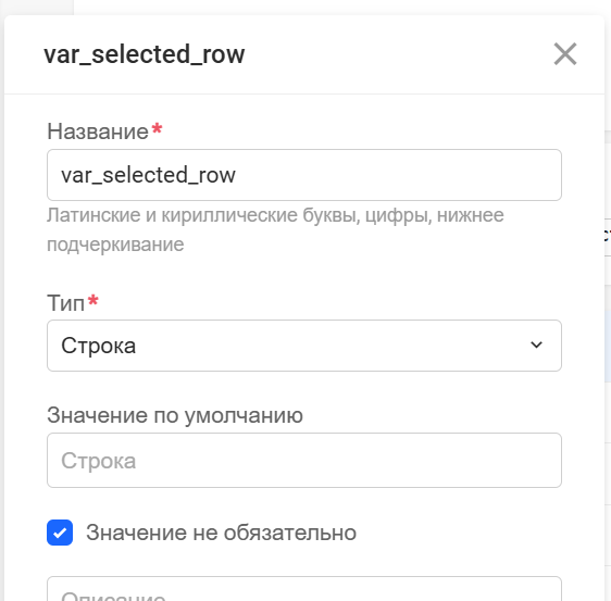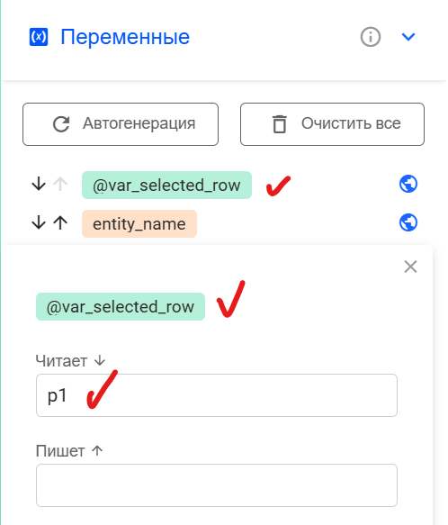 Для того, чтобы происходило автоматическое поднятние выбранного значения из Таблицы 1 в Таблице 2, нужно в источнике Таблицы 2 создать динамическую переменную (тип Строка, значение по умолчанию не обязательно. Картинка 2)