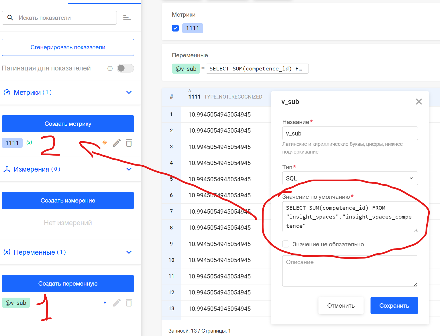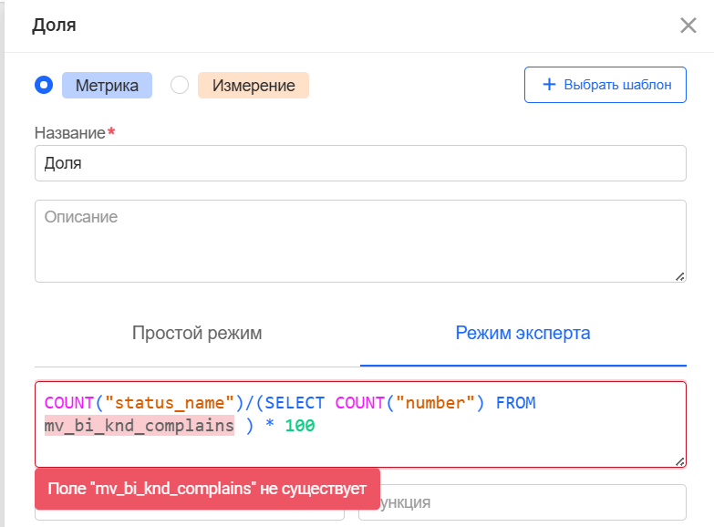 Добрый день. Да, к сожалению, из-за ввода проверки синтаксиса мы потеряли возможность написания подзапроса сразу в метрике. Но благодаря динамическим переменным подзапрос можно записать в качестве переменной, а потом уже использовать в метрике и получить тот же результат. На приведенном скрине пример того, как выглядит последовательность действий: 1. Создаем переменную типа SQL, в ее значении записываем наш подзапрос. 2. Сохраняемся. 3. Создаем метрику и в ней используем нашу переменную, например, 1000 / (${{v_sub}}). В момент выполнения запроса в метрике вместо переменной будет подставляться подзапрос.